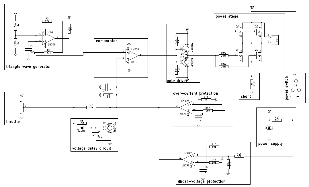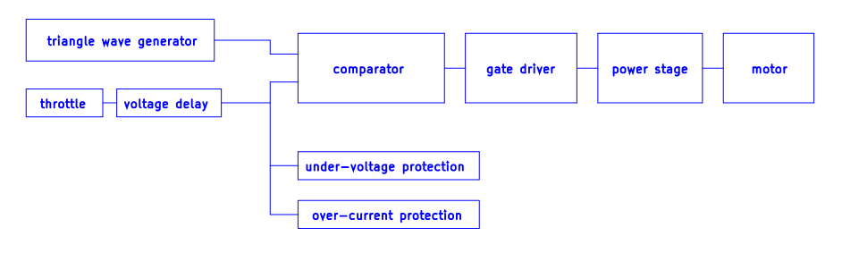 Motor controller could be divided into 7 functional blocks (refer to block diagram Image 1): triangle wave generator, throttle, voltage delay circuit, comparator, under-voltage and over-voltage protection, gate driver and power stage.