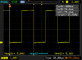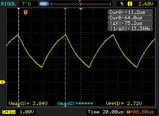 In the images above you can see waveforms on comparators output pin2 (left image) and comparators negative input pin4 (right image). Frequency of both signals is approximately 13.3kHz. Notice "triangle" wave is changing between approximately 1V and 4V.